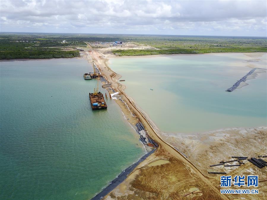 這是2017年5月10日在肯尼亞東北部曼達灣海域拍攝的拉穆港項目的引堤,引堤將大陸與人造陸地連在一起。2012年3月,肯尼亞聯(lián)合南蘇丹和埃塞俄比亞啟動了“拉穆港-南蘇丹-埃塞俄比亞交通走廊”項目。項目包括鐵路、公路和石油管線等諸多組成部分,總投資額約250億美元。同年,中國交建從17家通過資格預審的國際公司中脫穎而出,獲得拉穆港項目的承建權。新華社記者潘思危攝