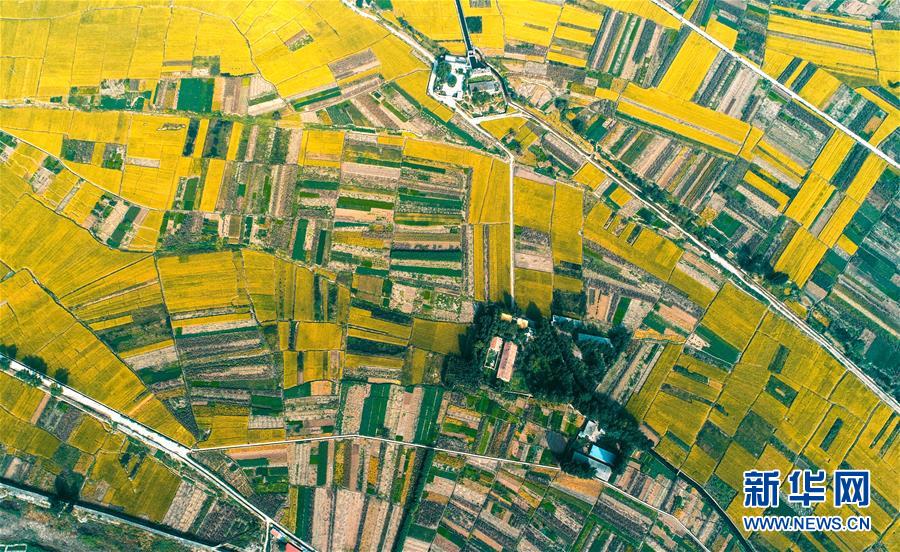 這是9月30日無人機拍攝的河北省涉縣白芟村的稻田。 近日,位于太行山下的河北省涉縣白芟村上千畝水稻逐漸成熟。從空中俯瞰,猶如一塊塊“調(diào)色盤”,美不勝收。 新華社記者 王曉 攝