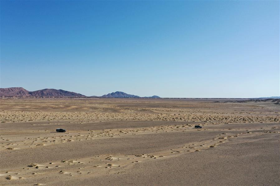 9月25日,內(nèi)蒙古自治區(qū)額濟(jì)納旗算井子邊境派出所的民警開(kāi)車(chē)對(duì)轄區(qū)進(jìn)行巡護(hù)(無(wú)人機(jī)拍攝)。新華社記者劉磊攝