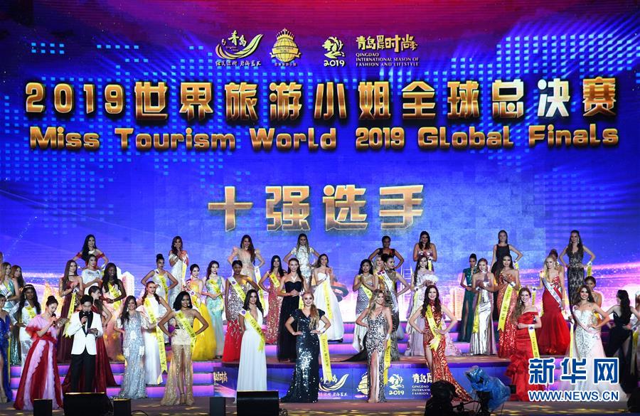 10月6日,選手在頒獎儀式上。 10月6日晚,2019世界旅游小姐全球總決賽頒獎盛典在山東青島舉行。來自67個國家和地區(qū)的佳麗在民族服裝、泳裝、晚裝以及才藝展示環(huán)節(jié)各展風(fēng)采,最終來自墨西哥和加拿大的兩名選手分獲冠亞軍,中國選手譚若依獲得季軍。 新華社記者 李紫恒 攝