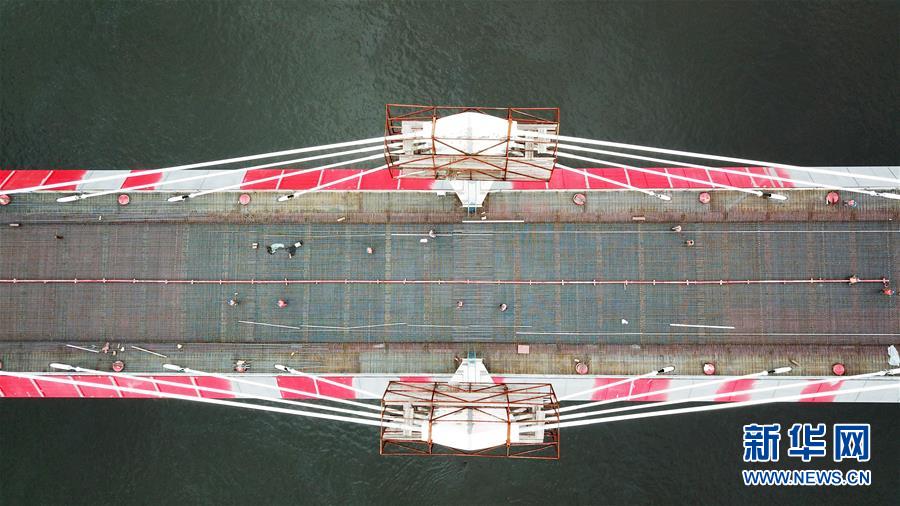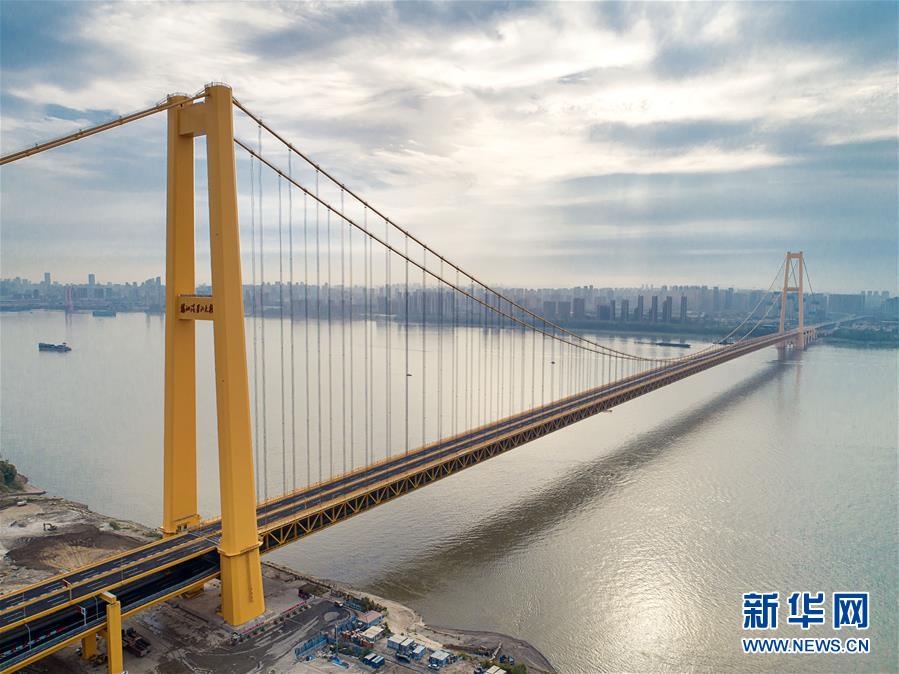 楊泗港大橋建設創(chuàng)造了多項世界之最:一是主橋跨度達1700米,為世界上跨度最大的雙層懸索橋;二是主橋設置雙層雙向12車道,是世界上通行能力最大的公路橋梁;三是大橋主纜設計張力6.5萬噸,采用了世界上強度等級最高的主纜鋼絲;四是大橋設置機動車道、非機動車道、人行觀光道,集過江交通與觀光于一體,是長江上功能最完備的橋梁。新華社記者熊琦攝
