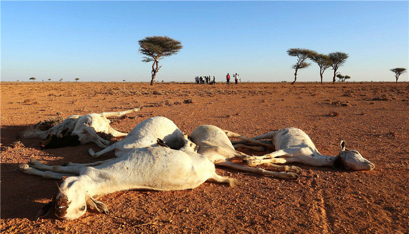 當?shù)貢r間2016年12月15日,索馬里邦特蘭,干旱的土地上散布著羊的尸體。當?shù)卦庥龈珊堤鞖?,牲畜受到危害?br>