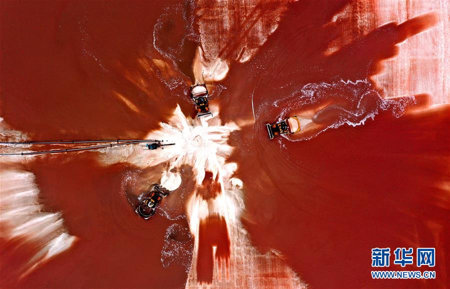 魯北鹽場工人在鹽池中收獲海鹽(10月9日無人機拍攝)。新華社記者 朱崢 攝