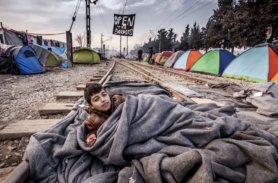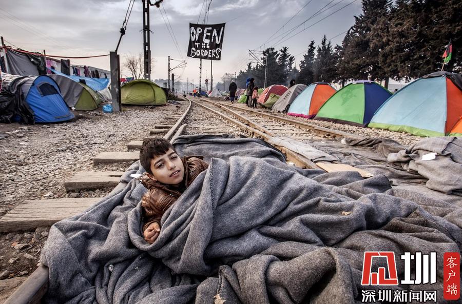 當地時間2016年3月22日,希臘伊多梅尼,來自敘利亞阿勒頗的難民男孩躺在鐵軌上睡覺。