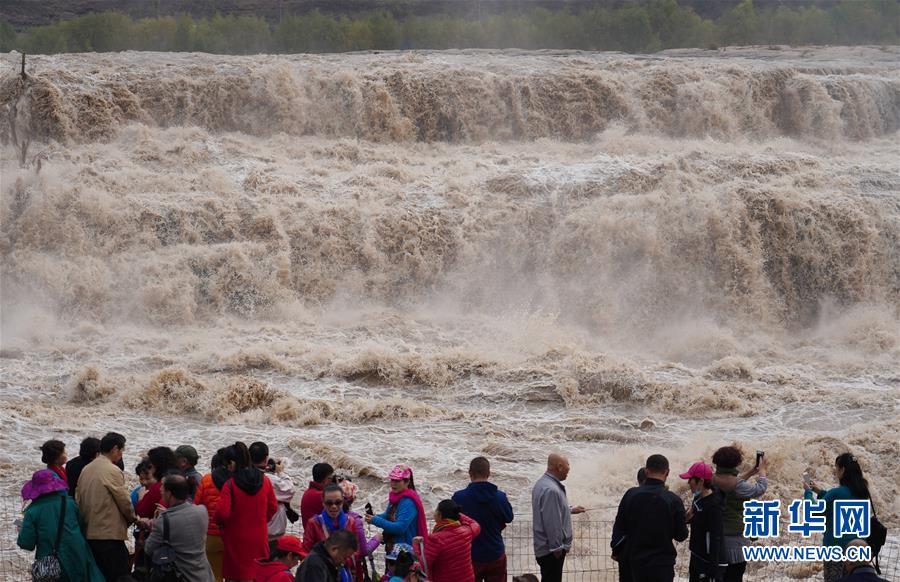 受近日降雨影響,位于山西吉縣的壺口瀑布水量增大,壯美的瀑布群景觀吸引眾多游客前來(lái)觀賞。新華社記者楊晨光攝