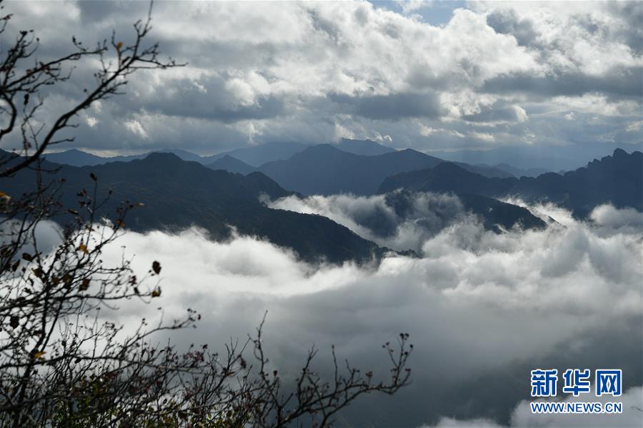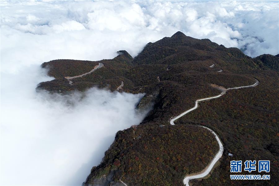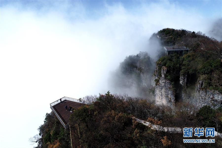 10月17日,游客在漢中市南鄭區(qū)龍頭山風(fēng)景區(qū)拍照。 陜西省漢中市南鄭區(qū)龍頭山風(fēng)景區(qū)位于川陜交界處米倉(cāng)山主梁。龍頭山景區(qū)常年云霧繚繞,宛如仙境,還有奇石、云海、彩林、霧凇等景觀令游客流連忘返。 新華社記者 張博文 攝