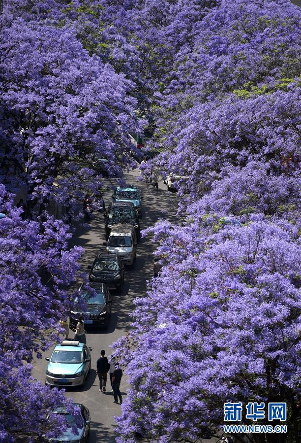 昆明市教場中路一帶的藍花楹進入盛花期(4月24日攝)。新華社記者秦晴攝