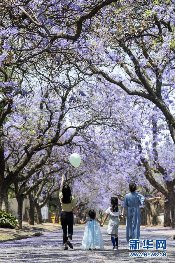 10月20日,在南非比勒陀利亞,游人在藍花楹樹下賞花。新華社記者陳誠攝