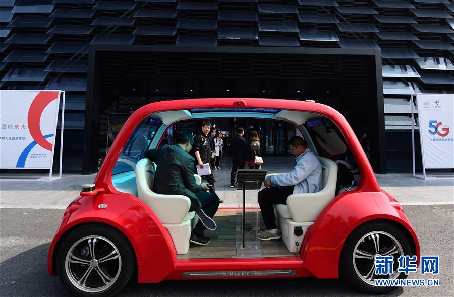 10月21日在浙江烏鎮(zhèn)舉行的互聯網之光博覽會會場外拍攝的5G無人駕駛體驗車。新華社記者尹棟遜攝