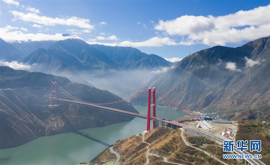 俯瞰雅康高速瀘定大渡河大橋(10月16日無人機(jī)拍攝)。該橋主橋?yàn)?100米單跨鋼桁梁懸索橋,2018年底建成通車。 新華社記者 江宏景 攝