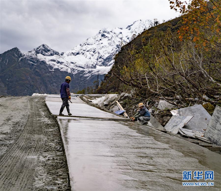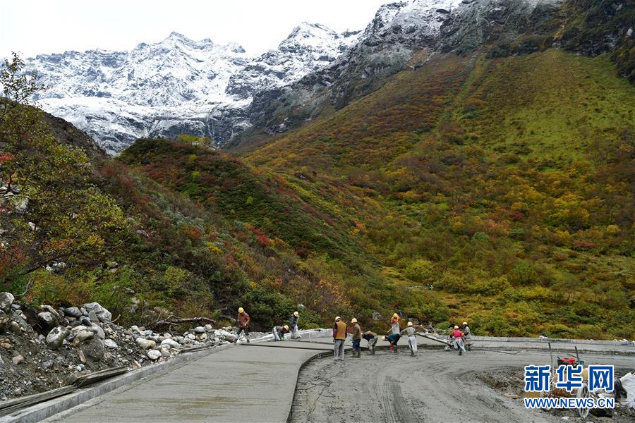 工人們?cè)谂赡r(nóng)村公路施工現(xiàn)場(chǎng)作業(yè)(10月24日攝)。新華社記者普布扎西攝