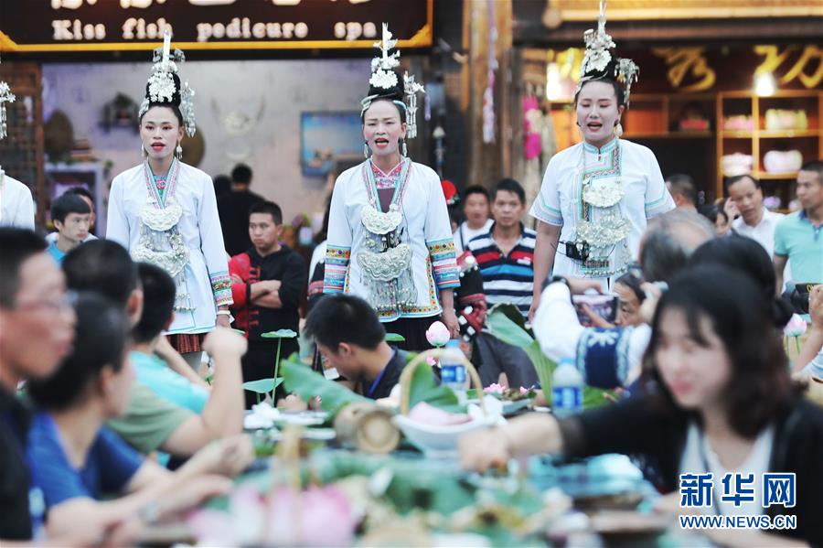 7月2日,侗族同胞在丹寨萬達小鎮(zhèn)內(nèi)為游客演唱侗族大歌。新華社記者歐東衢攝