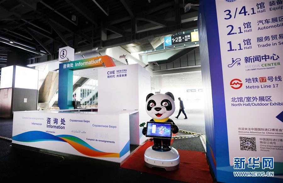 10月25日,位于國(guó)展中心內(nèi)的國(guó)家會(huì)議中心入口處張貼了醒目的進(jìn)博會(huì)吉祥物熊貓進(jìn)寶裝飾。 新華社記者 方喆攝