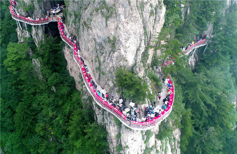2018年7月8日,河南洛陽老君山舉行觀海避暑節(jié),在半山腰海拔2000米的懸崖棧道上安排了一場“云海盛宴”,設(shè)下免費午餐,讓民眾免費品嘗蘑菇山珍、大蝦、時令水果、新鮮果汁,精美點心等。DF/視覺中國