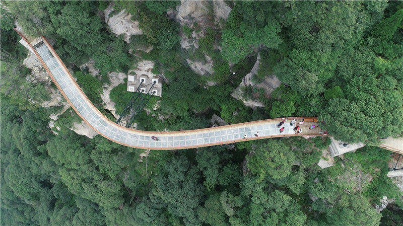 2018年6月23日,陜西渭南,游客們?cè)谏偃A山懸空玻璃棧道上游覽拍照。航拍少華山懸空玻璃棧道,下面就是懸崖密林。王警/視覺中國(guó)