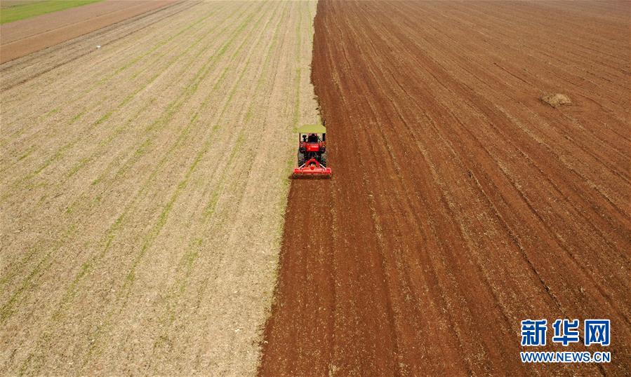 河南省寶豐縣趙莊鎮(zhèn)周營村農民駕駛機械在農田里犁地(10月17日無人機拍攝)。