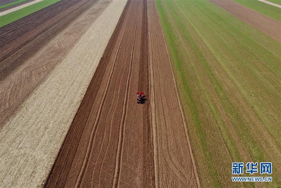 河南省寶豐縣肖旗鄉(xiāng)解莊村農民駕駛機械在農田里搶種冬小麥(10月17日無人機拍攝)。新華社記者李嘉南攝