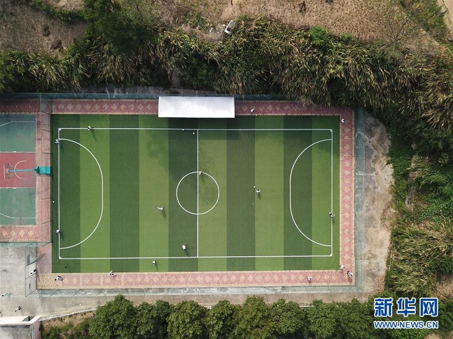 金寨縣希望小學(xué)學(xué)生在上足球課(9月3日無人機(jī)拍攝)。新華社記者劉軍喜攝