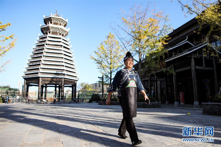 10月29日,楊芳從丹寨萬(wàn)達(dá)小鎮(zhèn)內(nèi)的鼓樓前經(jīng)過(guò)。