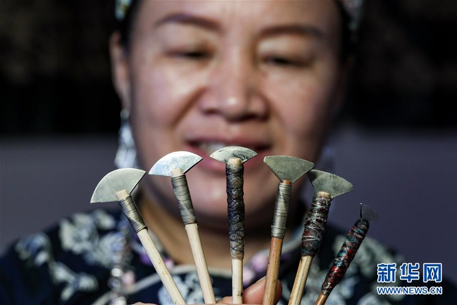 10月28日,楊芳在展示制作蠟染的蠟刀。新華社記者 歐東衢 攝