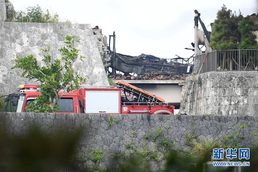 10月31日,在日本沖繩縣那霸市,消防人員站在琉球王國都城遺址首里城外。新華社記者華義攝