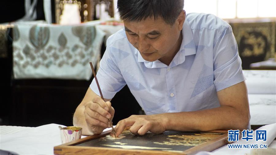 北京金漆鑲嵌有限責(zé)任公司工藝美術(shù)大師胡昕在創(chuàng)作漆畫(huà)屏風(fēng)(9月19日攝)。新華社記者李欣攝