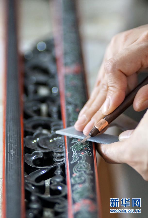 北京金漆鑲嵌有限責任公司的技師在制作漆藝制品(10月31日攝)。新華社記者李欣攝