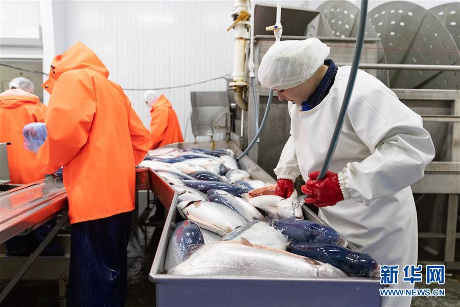 9月13日,在俄羅斯摩爾曼斯克,俄羅斯水產(chǎn)養(yǎng)殖公司工作人員在車間處理鮭魚。 新華社記者白雪騏攝