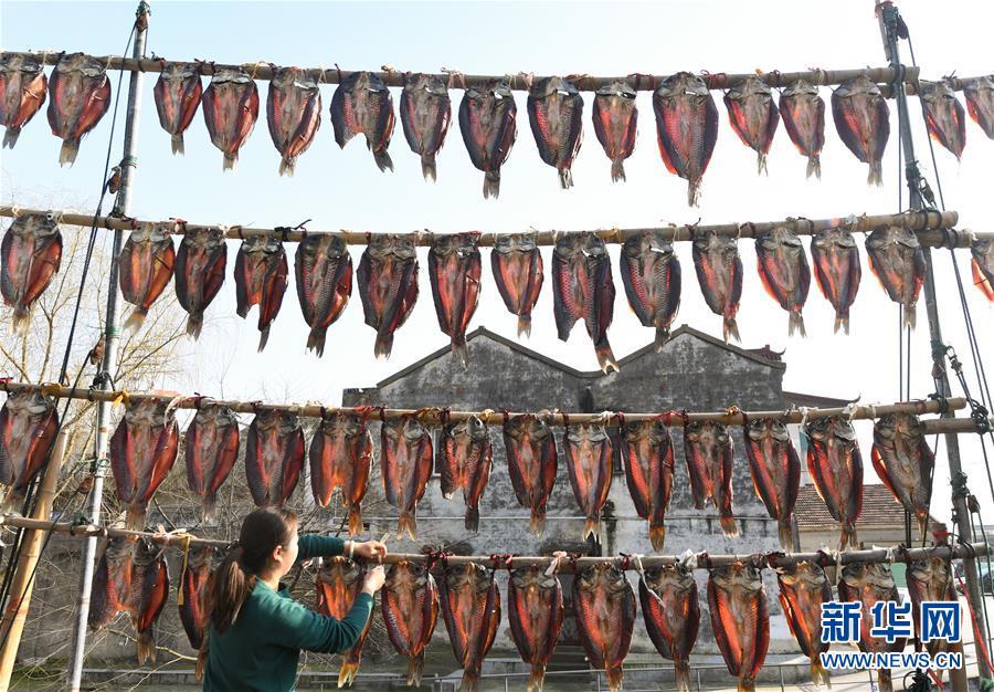 3月12日,浙江省湖州市吳興高新區(qū)幻溇村村民在曬魚干。近日,太湖南岸湖州地區(qū)久雨初晴,漁民忙著制作、晾曬魚干。新華社記者翁忻旸攝