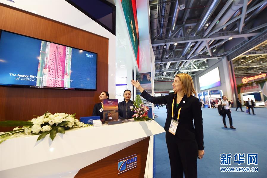 這是在第二屆進博會上拍攝的希臘比雷埃夫斯港展臺(11月8日攝)。新華社記者尹炣攝