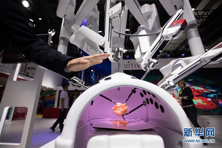 這是在第二屆進(jìn)博會醫(yī)療器械及醫(yī)藥保健展區(qū)拍攝的機(jī)器人輔助腹腔鏡手術(shù)系統(tǒng)(11月7日攝)。新華社記者金立旺攝