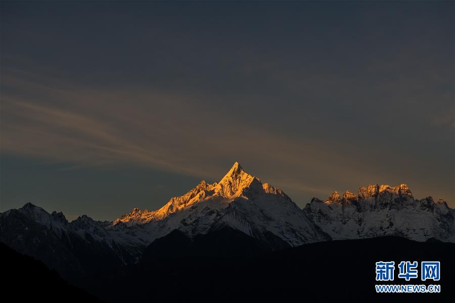 日出時分,陽光照射在梅里雪山緬茨姆峰上(11月8日攝)。 初冬時節(jié),位于云南省西北部的迪慶藏族自治州境內的梅里雪山、普達措、納帕海、白水臺等景色迷人。 新華社記者 胡超 攝