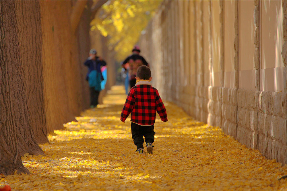 2019年11月11日,北京,西城區(qū)三里河數(shù)百米銀杏大道一片金黃,吸引眾多游人欣賞拍照。