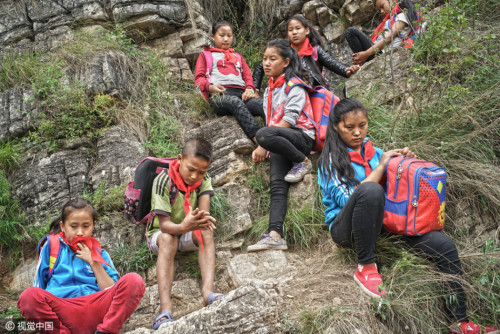上學(xué)的孩子都背著沉沉的書包,大多數(shù)是女孩,15個孩子在三個家長的保護下,大約用了2個小時,到達“懸崖村”。上山容易下山難,遇到雨雪天氣,村里人就不再外出了。 圖片來源:視覺中國