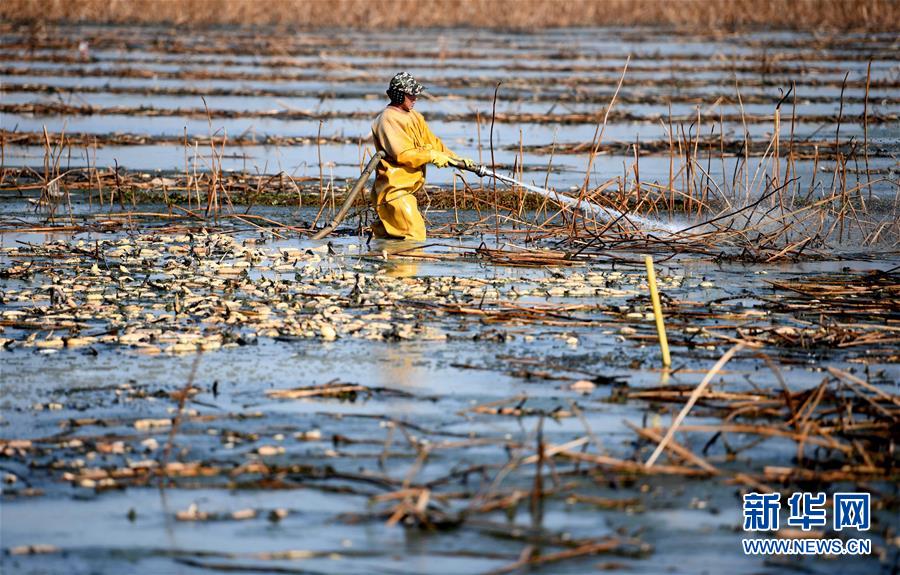 11月18日,工人在采收蓮藕。初冬時節(jié),河北省唐山市曹妃甸蓮藕豐收,工人們在結冰之前忙著采收蓮藕。新華社記者楊世堯攝