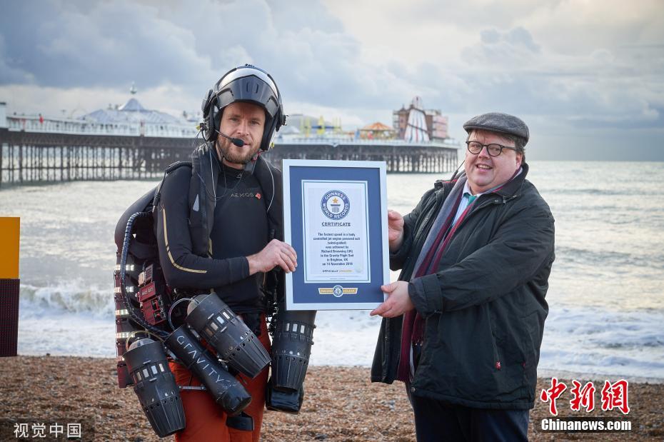 11月18日訊,英國(guó)布萊頓,英國(guó)發(fā)明家理查德·布朗寧穿著一套由身體控制、噴氣發(fā)動(dòng)機(jī)驅(qū)動(dòng)、風(fēng)力導(dǎo)向的飛行服,以高達(dá)每小時(shí)85.06英里(約137公里)的飛行速度,打破了自己創(chuàng)下的噴氣式飛行服速度的吉尼斯世界紀(jì)錄。圖為工作人員為理查德·布朗寧頒獎(jiǎng)。圖片來(lái)源:視覺(jué)中國(guó)