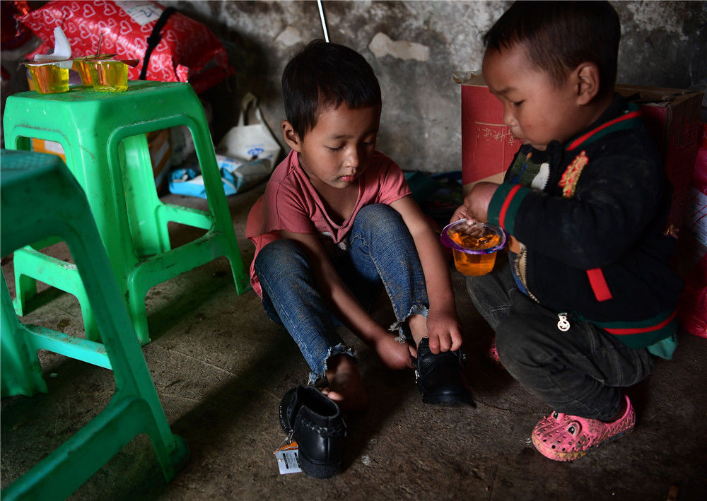 2019年11月16日,四川涼山,回到家,楊陽(yáng)的女兒楊英(左)就迫不及待地試穿新鞋。