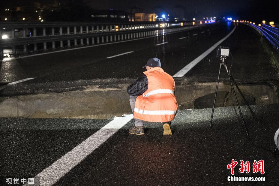 當(dāng)?shù)貢r(shí)間2019年11月24日,意大利Villafranca dAsti,意大利遭受惡劣天氣和持續(xù)多日的暴雨,通往都靈方向的A21高速公路路面出現(xiàn)“大坑”。圖片來(lái)源:視覺(jué)中國(guó)