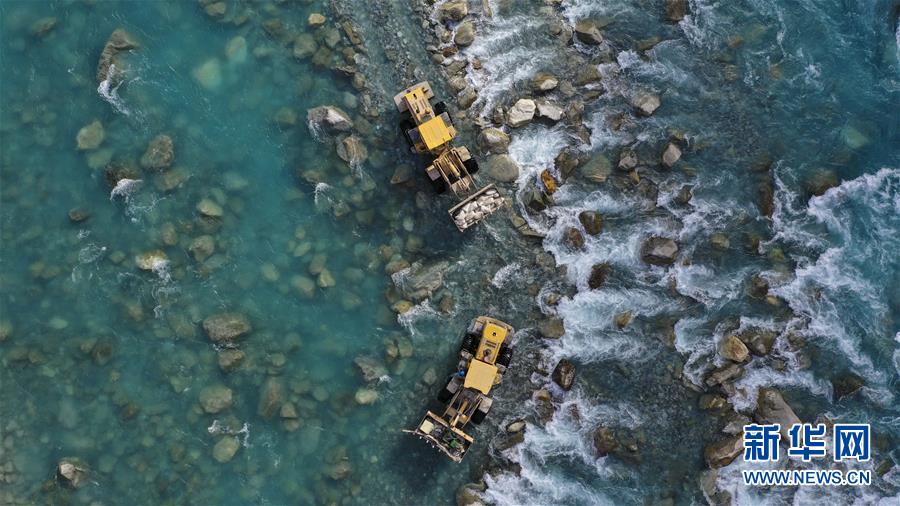 在新疆塔什庫爾干塔吉克自治縣大同鄉(xiāng)庫如克欄桿村,電力工人利用施工車輛運送水泥、鐵塔零件過河,為鋪設(shè)線路做準備(11月24日無人機拍攝)。