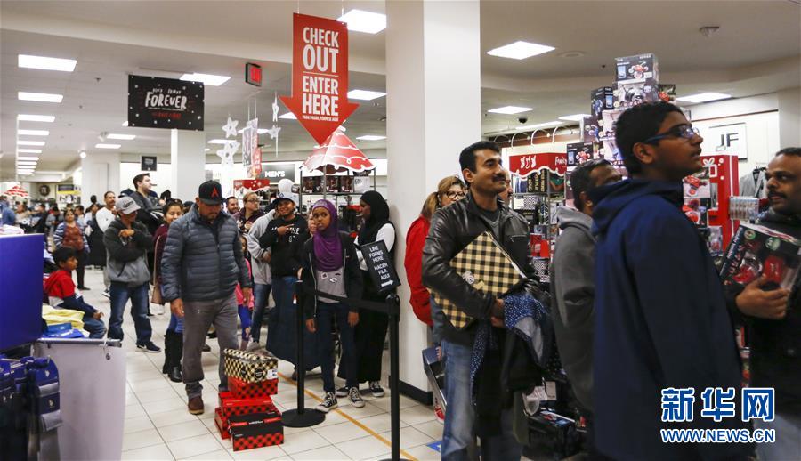 11月28日,在美國加利福尼亞州圣安娜的一家商場,人們排隊結賬。新華社記者李穎攝