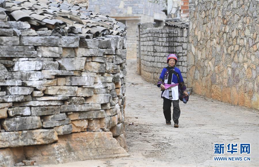 11月28日,69歲的大糯黑村村民何蘭香在村里的商店買(mǎi)完?yáng)|西后回家。