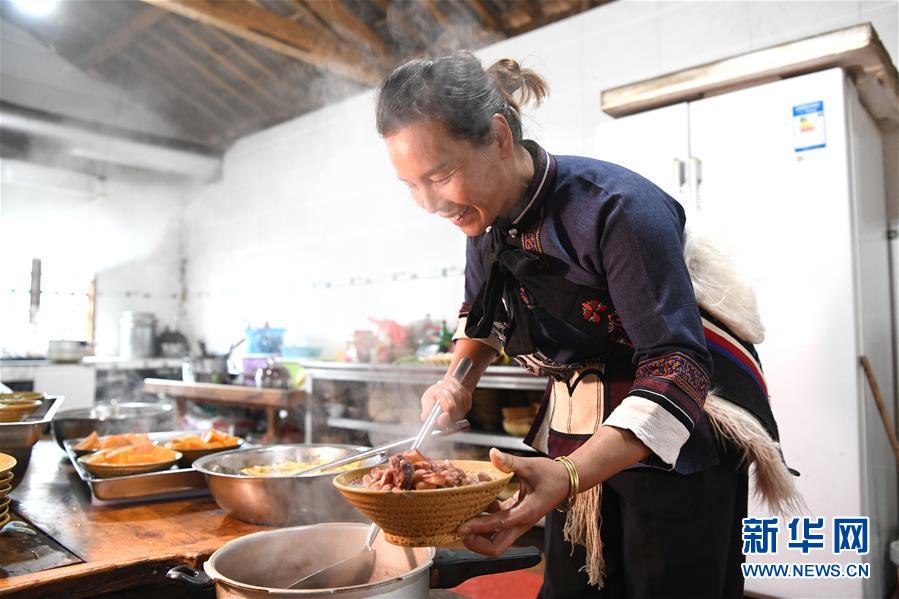11月28日,42歲的大糯黑村村民李學芝在廚房內為游客準備午餐。李學芝和丈夫畢興學經營著一家農家樂,生意紅火。新華社記者周華攝