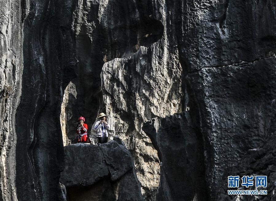 當(dāng)?shù)厣贁?shù)民族樂手在石林景區(qū)演奏民族音樂(11月27日攝)。新華社記者蘭紅光攝