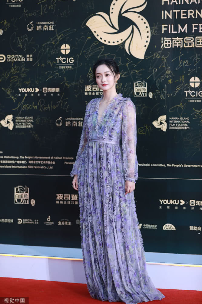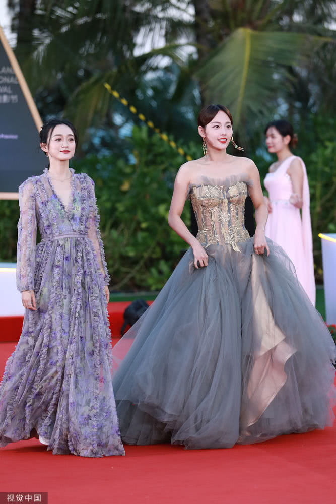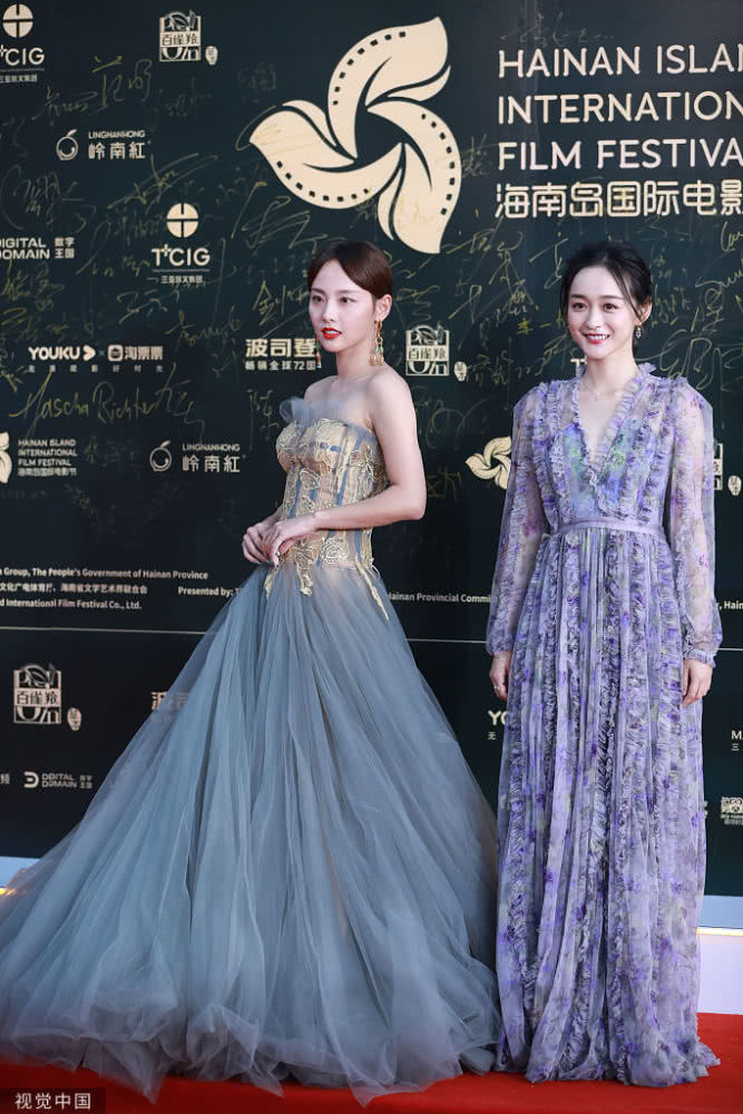 2019年12月1日,三亞,第二屆海南島國際電影節(jié)。何泓姍彎腰為張嘉倪整理裙擺,跟此前劇中傲嬌跋扈的“玫嬪”人設大不相同。