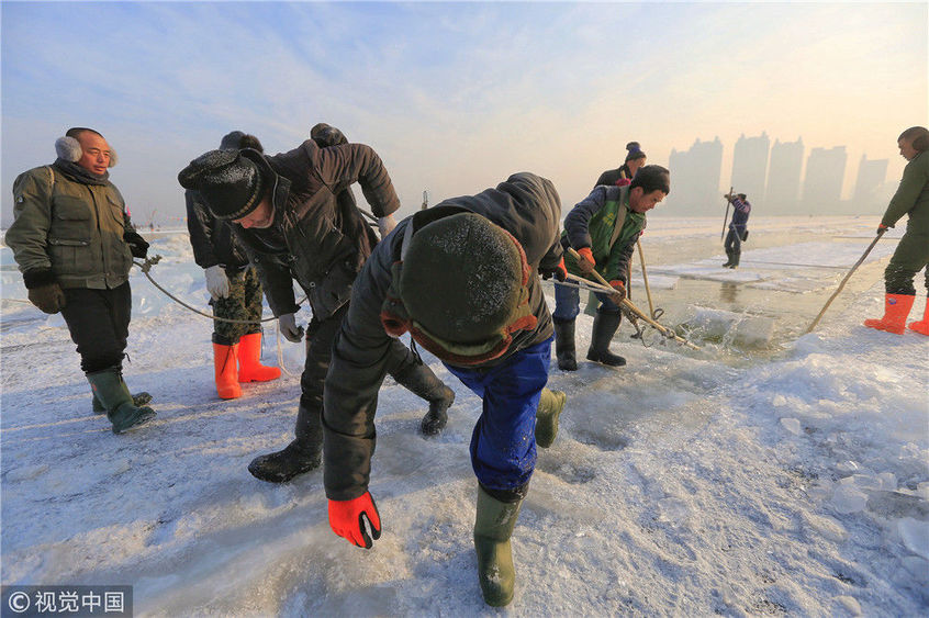2018年12月11日,黑龍江省哈爾濱市,松花江上,采冰者們彎腰拉繩,宛如纖夫般拽重達(dá)半噸的冰塊出水。采冰者都是自哈市江北萬寶、東發(fā)、沙陀子等鄉(xiāng)鎮(zhèn)的農(nóng)民,他們每年冬閑時(shí)都會(huì)親屬、村鄰之間結(jié)伴到松花江畔采冰,有的采冰人,已經(jīng)連續(xù)干了二十多年。每個(gè)采冰季,他們每天要在冰面上工作10-12個(gè)小時(shí),每個(gè)采冰組,一天要拽出冰塊2000-3000塊,一個(gè)近20天的采冰季,每人能收入近萬元。