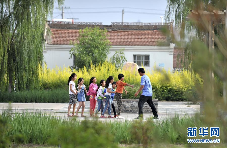 寧夏永寧縣原隆村的孩子們?cè)谛戮忧暗男蓍e廣場(chǎng)上玩耍(2018年8月攝)。新華社記者劉軍喜攝