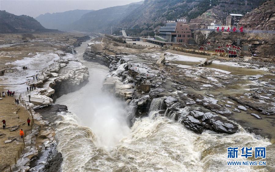 12月14日,游人在壺口瀑布景區(qū)游玩(無人機拍攝)。 位于秦晉大峽谷的黃河壺口瀑布,冬日水量較夏日雖然有所減少,但驚天動地的濤聲依舊,周圍石壁上的冰掛與河中的浪濤構(gòu)成一幅獨特的北國風光圖,吸引游客前來觀賞。 新華社記者 陶明 攝