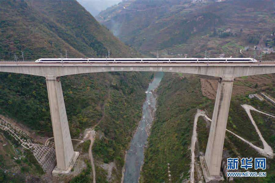 12月2日,一輛試驗列車駛過成貴高鐵鴨池河特大橋。新華社記者劉續(xù)攝