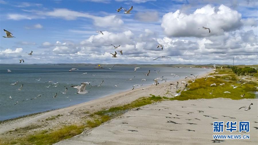 8月28日無人機拍攝的呼倫湖畔的水鳥。新華社記者沈伯韓攝