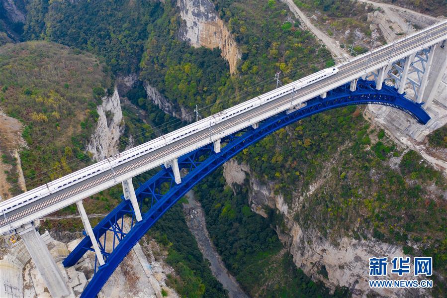 12月2日,一輛試驗(yàn)列車駛過成貴高鐵西溪河大橋(無人機(jī)拍攝)。新華社記者劉續(xù)攝